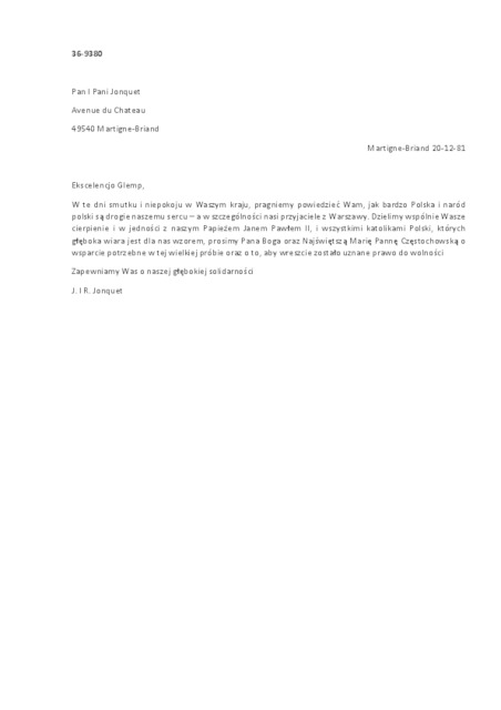 Kolekcja: Archiwa > Francuskie listy do księdza kardynała Józefa Glempa z okresu stanu wojennego > 36-9275-9428