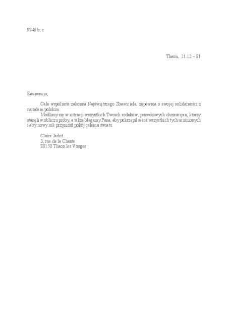 Kolekcja: | Archiwa > Francuskie listy do księdza kardynała Józefa Glempa z okresu stanu wojennego > 36-9782-9908 |