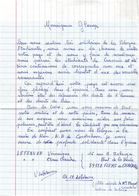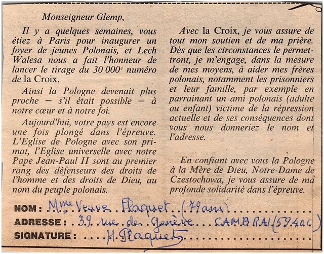 Kolekcja: Archiwa > Francuskie listy do księdza kardynała Józefa Glempa z okresu stanu wojennego > 36-9782-9908