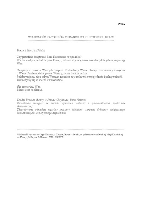 Kolekcja: Archiwa > Francuskie listy do księdza kardynała Józefa Glempa z okresu stanu wojennego > 36-9909-10029