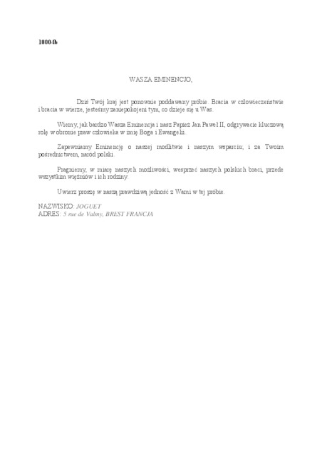 Kolekcja: | Archiwa > Francuskie listy do księdza kardynała Józefa Glempa z okresu stanu wojennego > 36-9909-10029 |