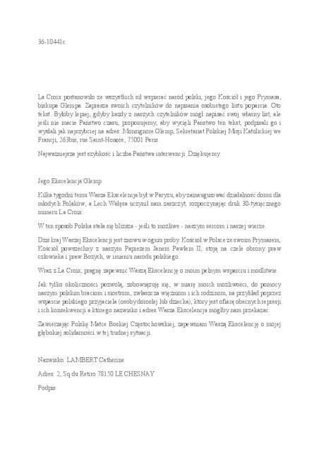Kolekcja: | Archiwa > Francuskie listy do księdza kardynała Józefa Glempa z okresu stanu wojennego > 36-10420-10554 |