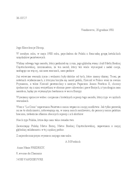 Kolekcja: | Archiwa > Francuskie listy do księdza kardynała Józefa Glempa z okresu stanu wojennego > 36-10420-10554 |
