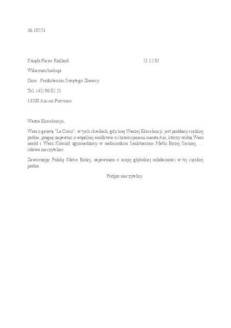 Kolekcja: Archiwa > Francuskie listy do księdza kardynała Józefa Glempa z okresu stanu wojennego > 36-10420-10554