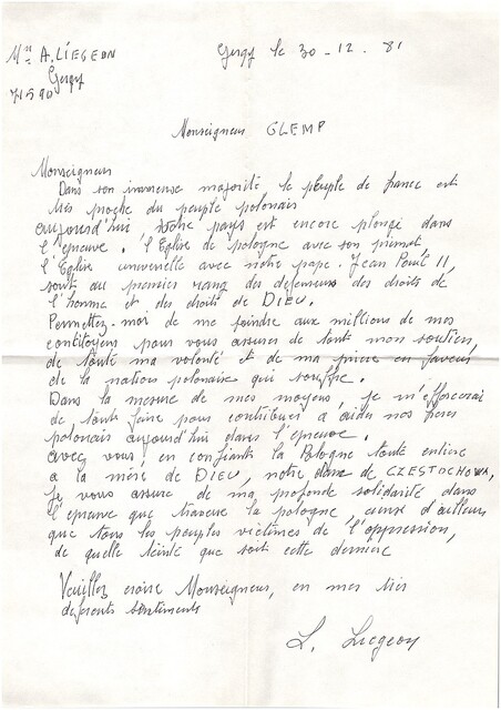 Kolekcja: | Archiwa > Francuskie listy do księdza kardynała Józefa Glempa z okresu stanu wojennego > 36-10555-10658 |