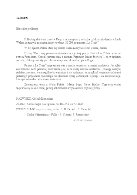 Kolekcja: | Archiwa > Francuskie listy do księdza kardynała Józefa Glempa z okresu stanu wojennego > 36-10659-10795 |