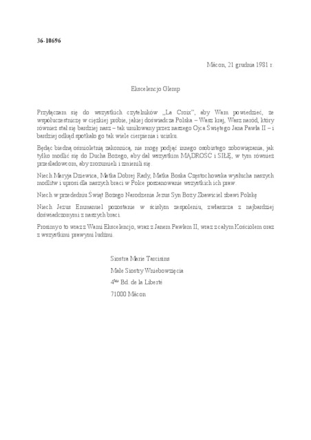 Kolekcja: | Archiwa > Francuskie listy do księdza kardynała Józefa Glempa z okresu stanu wojennego > 36-10659-10795 |