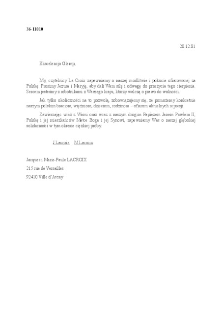 Kolekcja: Archiwa > Francuskie listy do księdza kardynała Józefa Glempa z okresu stanu wojennego > 36-10906-11043