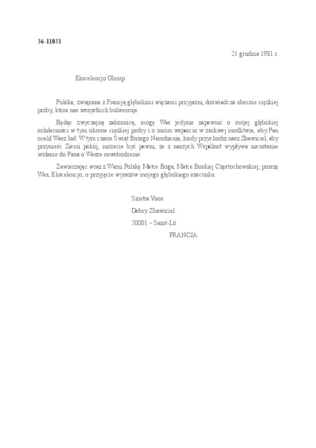 Kolekcja: | Archiwa > Francuskie listy do księdza kardynała Józefa Glempa z okresu stanu wojennego > 36-10906-11043 |