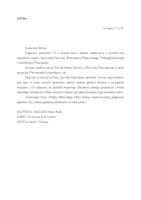 | Kolekcja: | Archiwa > Francuskie listy do księdza kardynała Józefa Glempa z okresu stanu wojennego > 36-11171-11288 |