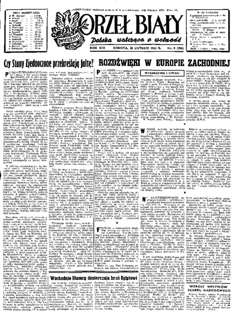 Orzeł Biały = (White Eagle): Polska walcząca o wolność, 1953 No. '9 (28 lutego)