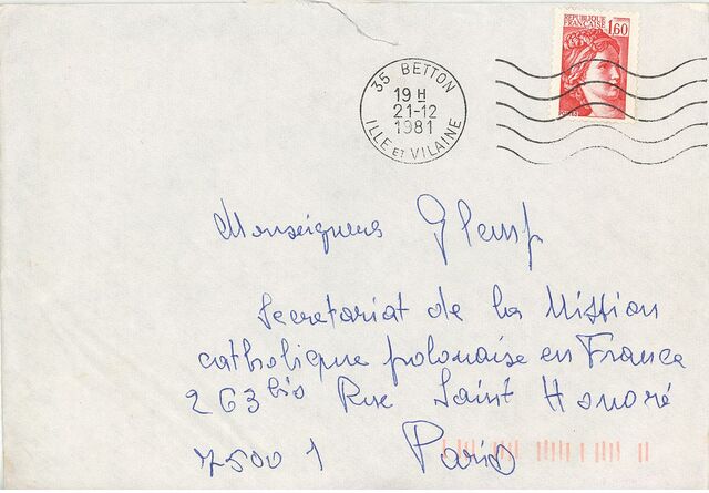 Kolekcja: Archiwa > Francuskie listy do księdza kardynała Józefa Glempa z okresu stanu wojennego > 36-11458-11573