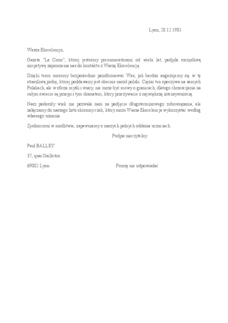 Kolekcja: Archiwa > Francuskie listy do księdza kardynała Józefa Glempa z okresu stanu wojennego > 36-11458-11573