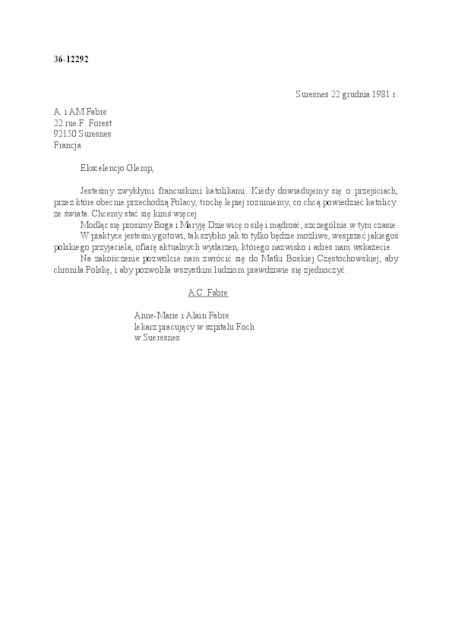 Kolekcja: | Archiwa > Francuskie listy do księdza kardynała Józefa Glempa z okresu stanu wojennego > 36-12264-12392 |