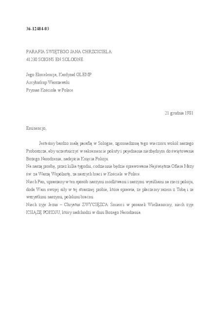 Kolekcja: | Archiwa > Francuskie listy do księdza kardynała Józefa Glempa z okresu stanu wojennego > 36-12393-12514 |