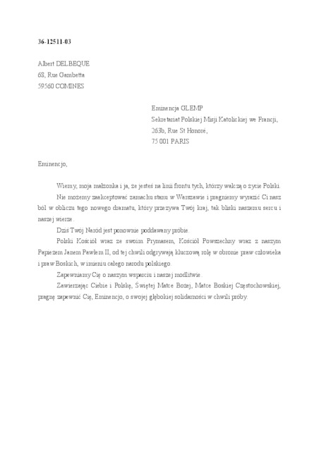 Kolekcja: | Archiwa > Francuskie listy do księdza kardynała Józefa Glempa z okresu stanu wojennego > 36-12393-12514 |