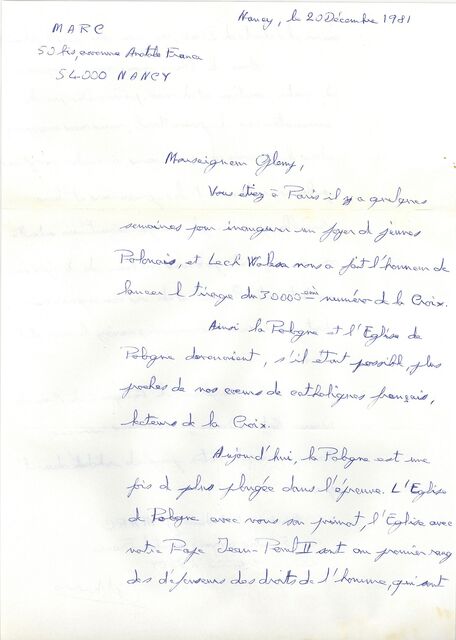 Kolekcja: | Archiwa > Francuskie listy do księdza kardynała Józefa Glempa z okresu stanu wojennego > 36-12515-12631 |