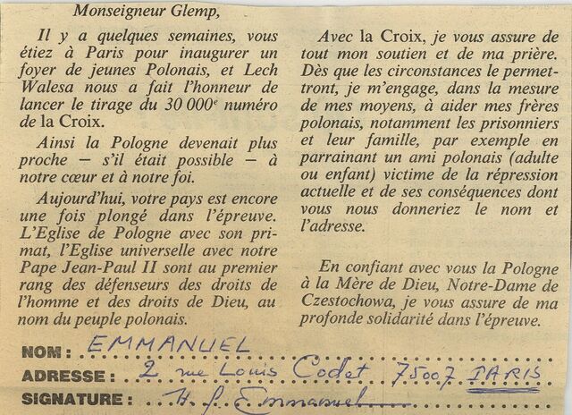 Kolekcja: | Archiwa > Francuskie listy do księdza kardynała Józefa Glempa z okresu stanu wojennego > 36-12515-12631 |