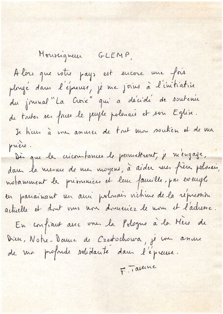Kolekcja: Archiwa > Francuskie listy do księdza kardynała Józefa Glempa z okresu stanu wojennego > 36-9152-9274