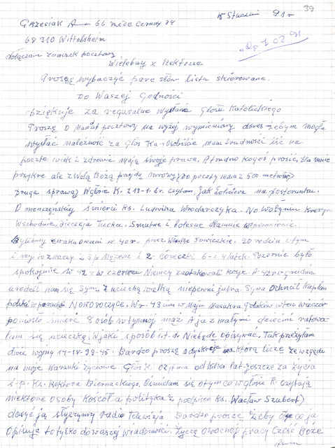 | Opis: | List Anny Grzesiak, styczeń 1991. |