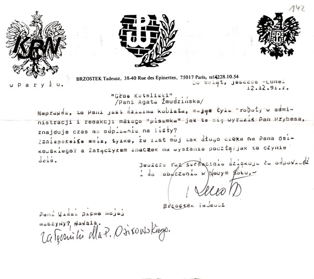 Kolekcja: Archiwa > Archiwum Polskiej Misji Katolickiej we Francji > Zespół 46. Archiwum "Głosu Katolickiego" > 19. Korespondencja 1991-1992