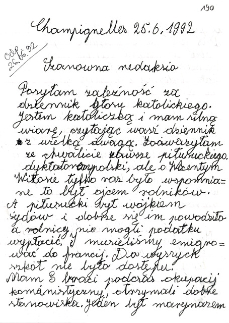 Kolekcja: Archiwa > Archiwum Polskiej Misji Katolickiej we Francji > Zespół 46. Archiwum "Głosu Katolickiego" > 19. Korespondencja 1991-1992
