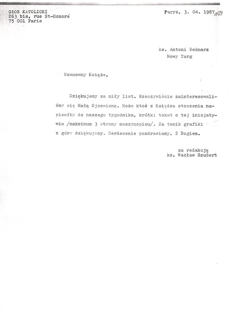Kolekcja: Archiwa > Archiwum Polskiej Misji Katolickiej we Francji > Zespół 46. Archiwum "Głosu Katolickiego" > 15. Korespondencja 1987