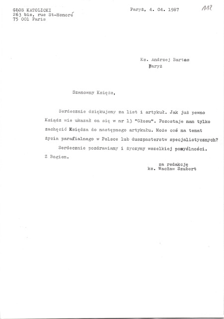 Kolekcja: Archiwa > Archiwum Polskiej Misji Katolickiej we Francji > Zespół 46. Archiwum "Głosu Katolickiego" > 15. Korespondencja 1987