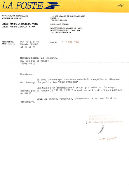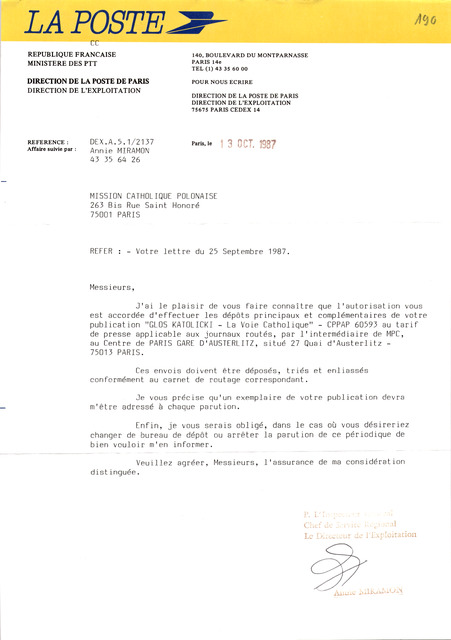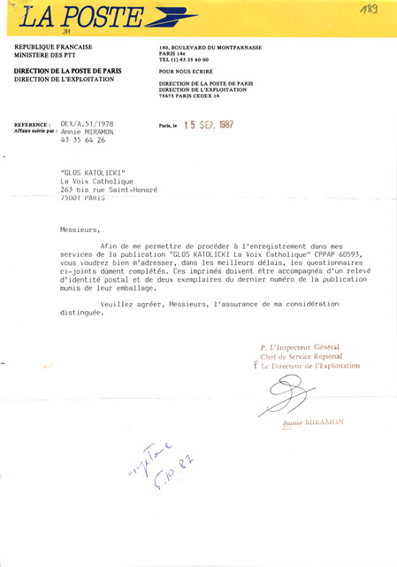 Kolekcja: Archiwa > Archiwum Polskiej Misji Katolickiej we Francji > Zespół 46. Archiwum "Głosu Katolickiego" > 15. Korespondencja 1987
