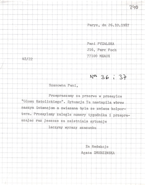 Kolekcja: Archiwa > Archiwum Polskiej Misji Katolickiej we Francji > Zespół 46. Archiwum "Głosu Katolickiego" > 15. Korespondencja 1987
