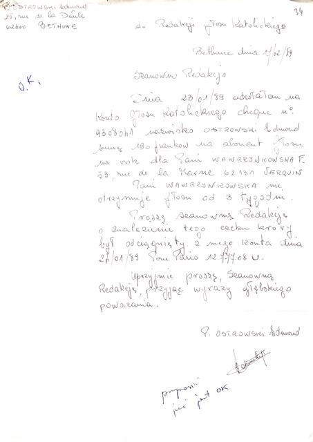 Kolekcja: Archiwa > Archiwum Polskiej Misji Katolickiej we Francji > Zespół 46. Archiwum "Głosu Katolickiego" > 17. Korespondencja 1989