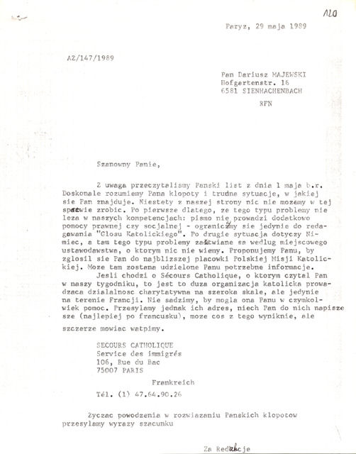 Kolekcja: Archiwa > Archiwum Polskiej Misji Katolickiej we Francji > Zespół 46. Archiwum "Głosu Katolickiego" > 17. Korespondencja 1989