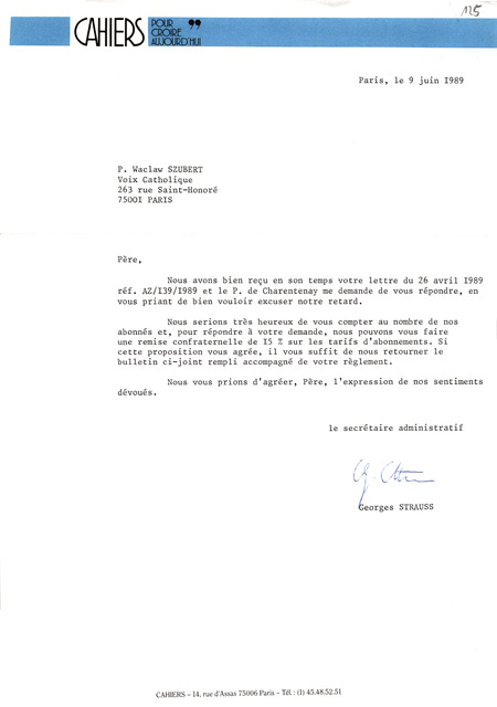Kolekcja: Archiwa > Archiwum Polskiej Misji Katolickiej we Francji > Zespół 46. Archiwum "Głosu Katolickiego" > 17. Korespondencja 1989