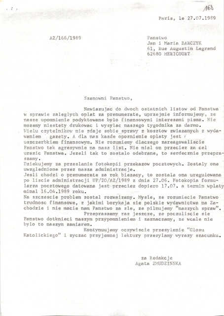 Kolekcja: Archiwa > Archiwum Polskiej Misji Katolickiej we Francji > Zespół 46. Archiwum "Głosu Katolickiego" > 17. Korespondencja 1989