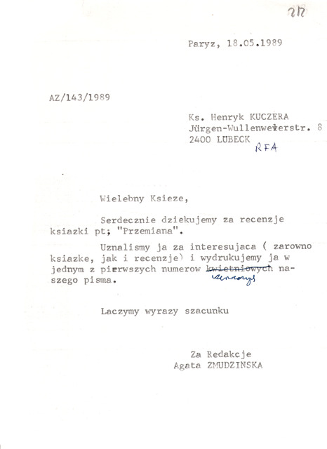 Kolekcja: Archiwa > Archiwum Polskiej Misji Katolickiej we Francji > Zespół 46. Archiwum "Głosu Katolickiego" > 17. Korespondencja 1989