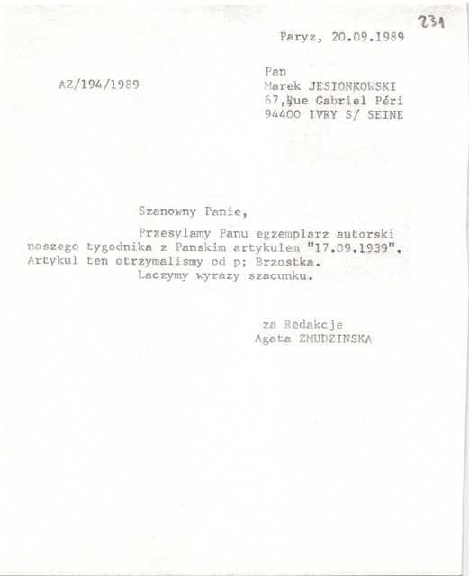 Kolekcja: Archiwa > Archiwum Polskiej Misji Katolickiej we Francji > Zespół 46. Archiwum "Głosu Katolickiego" > 17. Korespondencja 1989