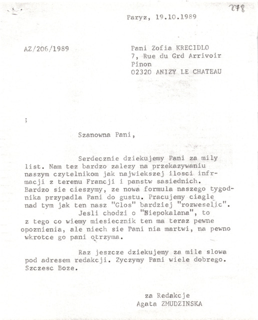 Kolekcja: Archiwa > Archiwum Polskiej Misji Katolickiej we Francji > Zespół 46. Archiwum "Głosu Katolickiego" > 17. Korespondencja 1989