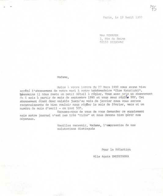Kolekcja: Archiwa > Archiwum Polskiej Misji Katolickiej we Francji > Zespół 46. Archiwum "Głosu Katolickiego" > 18. Korespondencja 1990
