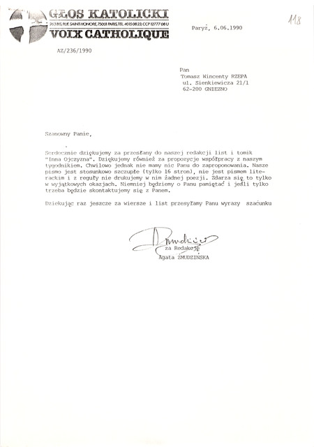 Kolekcja: Archiwa > Archiwum Polskiej Misji Katolickiej we Francji > Zespół 46. Archiwum "Głosu Katolickiego" > 18. Korespondencja 1990