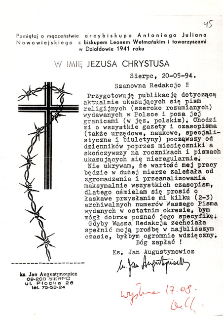 Kolekcja: Archiwa > Archiwum Polskiej Misji Katolickiej we Francji > Zespół 46. Archiwum "Głosu Katolickiego" > 21. Korespondencja 1994