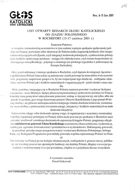 Kolekcja: Archiwa > Archiwum Polskiej Misji Katolickiej we Francji > Zespół 46. Archiwum "Głosu Katolickiego" > 24. Korespondencja 2000-2001