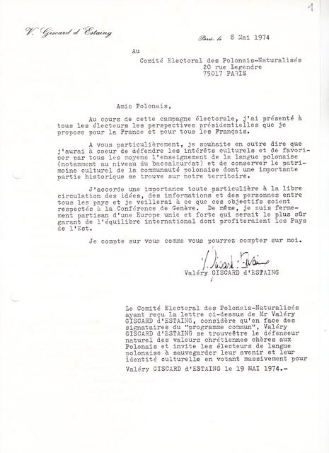 | Kolekcja: | Archiwa > Archiwum Polskiej Misji Katolickiej we Francji > Zespół 23. Comitee Electoral des Polonaise naturalises > 01 Korespondencja z Prezydentem Francji 1974-1975 |