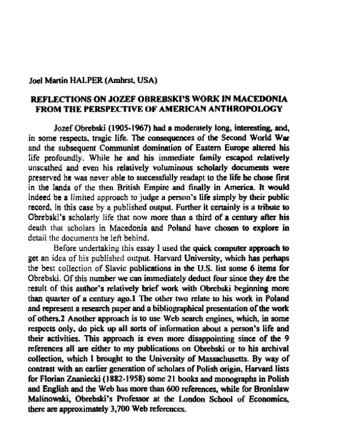 Reflection of Jozef Obrebski’s Work in Macedonia From the Perspective of American Anthropology