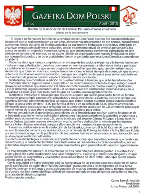 Gazetka Dom Polski : Boletín de la Asociación de Familias Peruano-Polacas en el Perú, 2010 No. 46 Abril