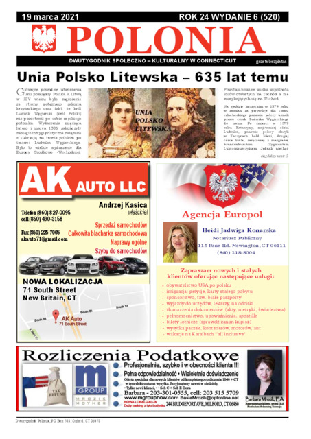 Polonia : Dwutygodnik Społeczno-Kulturalny w Connecticut 2021 R. 24 wyd. '6 (520), 19 marca