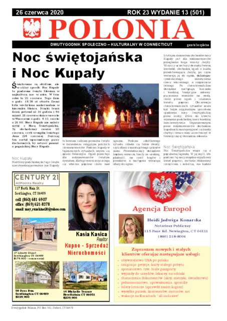 Polonia : Dwutygodnik Społeczno-Kulturalny w Connecticut 2020 R. 23 wyd. 13 (501), 26 czerwca