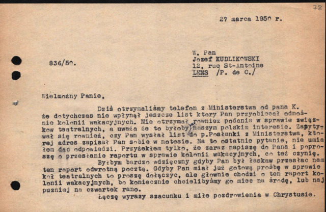 | Opis: | Pismo do J. Kudlikowskiego 27.03.1950 dot. m.in. kolonii wakacyjnych dla dzieci. |