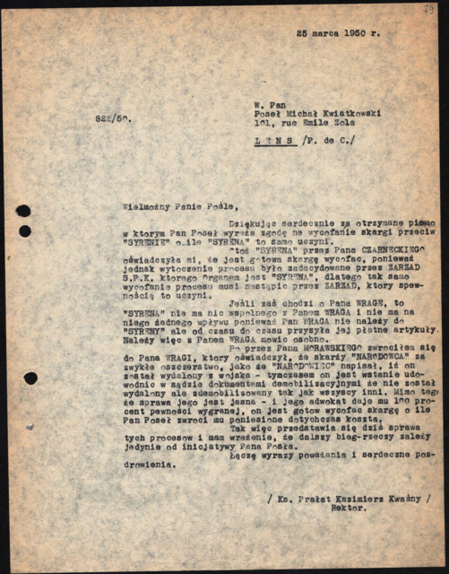 Opis: | Pismo K. Kwaśnego do Michała Kwiatkowskiego z 25.03.1950 r. dot. m.in. sporów z Zarządem Stowarzyszenia Polskich Kombatantów i czasopisma "Syrena" oraz z p. Wragą i artykułu w "Narodowcu". |