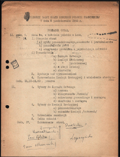 | Opis: | Pierwszy Walny Zjazd Kongresu Polonii Francuskiej w dniu 8 października 1950 r. Porządek obrad. |