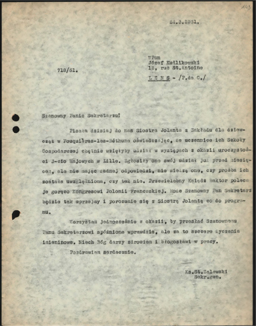 | Opis: | Pismo do J. Kudlikowskiego z 22.03.1951 r. dot. organizacji obchodów święta 3 Maja w Lille. |